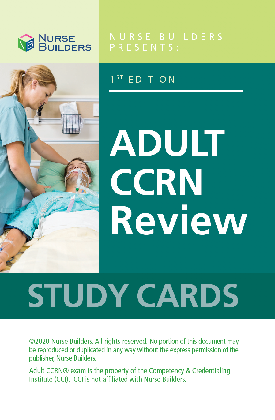 Whether you plan to study individually or as part of a group, Nurse Builders Adult CCRN Review Study Cards are an excellent adjunct to your Adult CCRN Exam preparation. Using Adult CCRN Review Study Cards is an effective and efficient way to review important adult critical care nursing content in preparation for the Adult CCRN Exams. Use these study cards to review important information for the Adult CCRN Exams.
