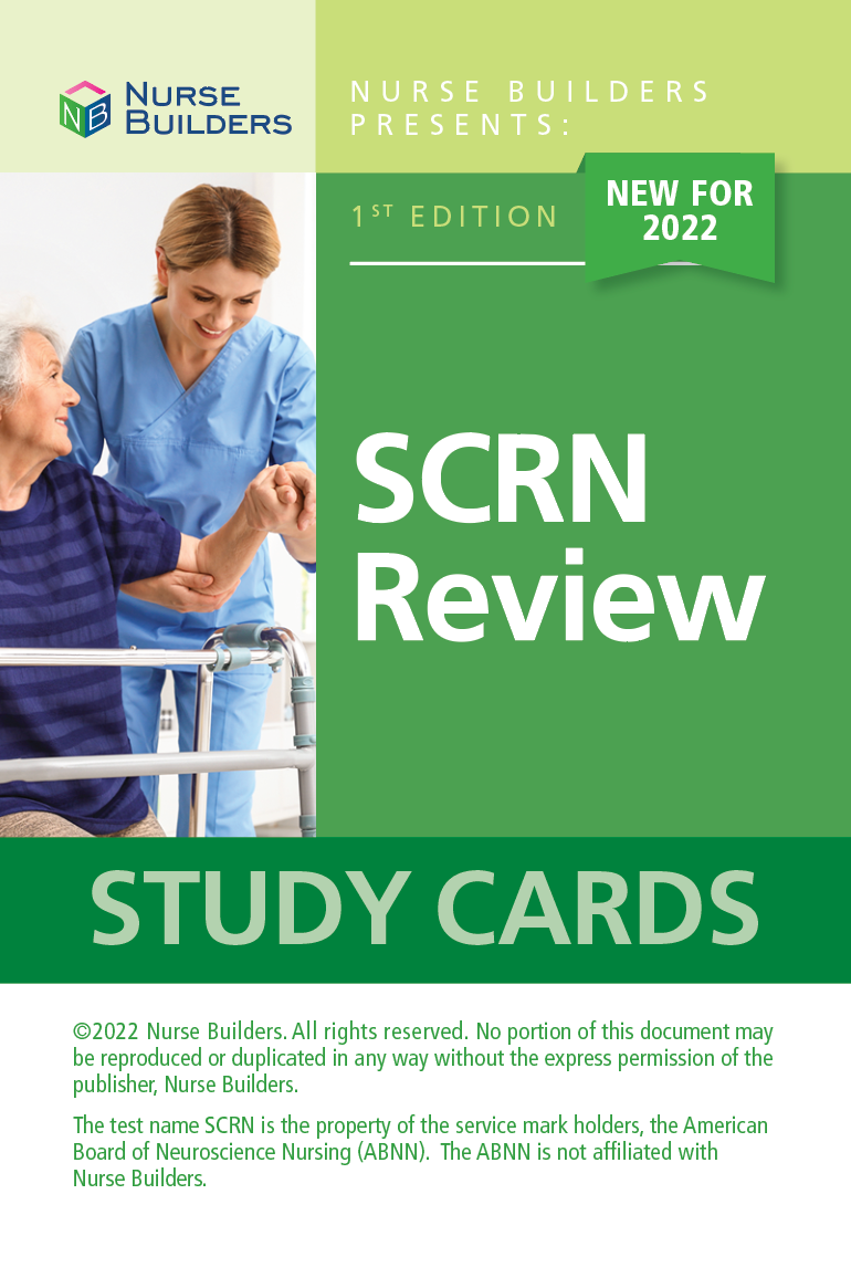 Whether you plan to study individually or as part of a group, Nurse Builders SCRN Review Study Cards are an excellent adjunct to your SCRN Exam preparation. Using SCRN Review Study Cards is an effective and efficient way to review important stroke nursing content in preparation for the SCRN Exam. Use these study cards to review important information for the SCRN Exam.