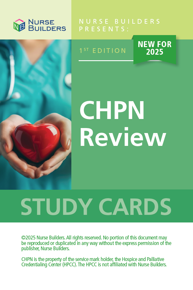 Whether you plan to study individually or as part of a group, Nurse Builders CHPN Review Study Cards are an excellent adjunct to your CHPN Exam preparation. Using CHPN Review Study Cards is an effective and efficient way to review important hospice and palliative nursing content in preparation for the CHPN Exam. Use these study cards to review important information for the CHPN Exam.