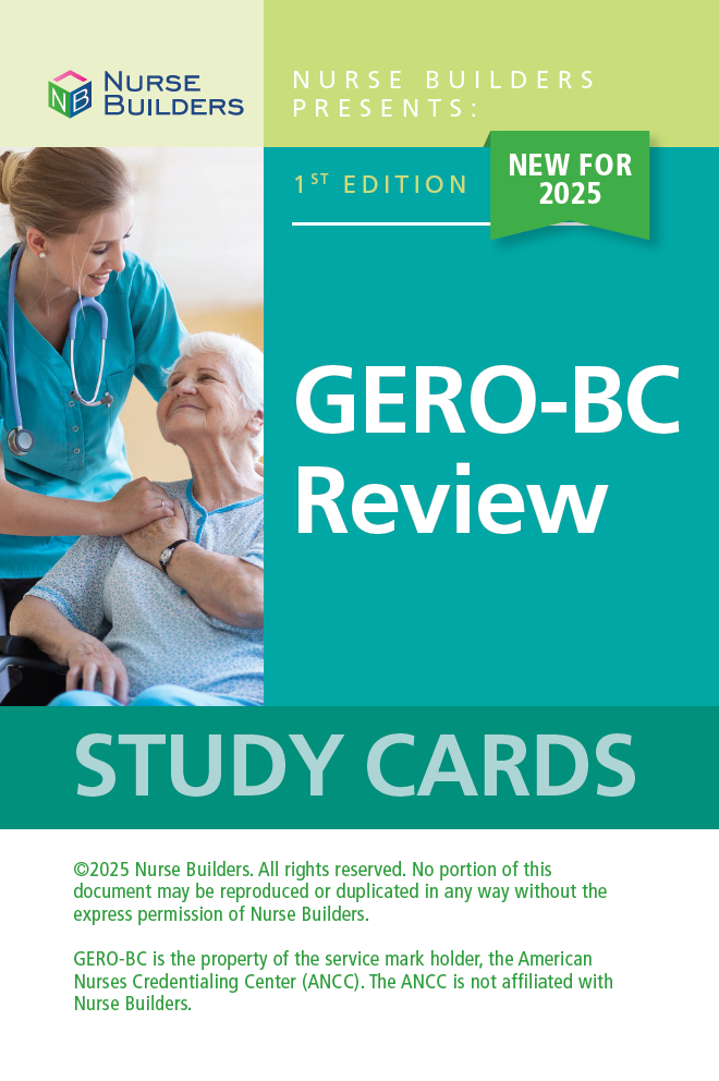 Whether you plan to study individually or as part of a group, Nurse Builders GERO-BC Review Study Cards are an excellent adjunct to your GERO-BC Exam preparation. Using GERO-BC Review Study Cards is an effective and efficient way to review important gerontological nursing content in preparation for the GERO-BC Exams. Use these study cards to review important information for the GERO-BC Exams.