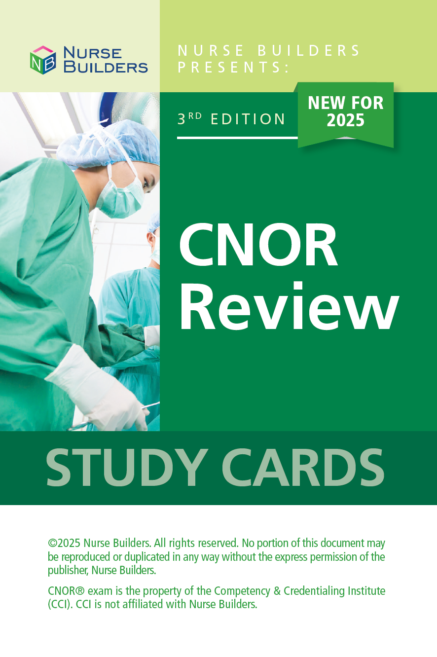 Whether you plan to study individually or as part of a group, Nurse Builders CNOR Review Study Cards are an excellent adjunct to your CNOR Exam preparation. Using CNOR Review Study Cards is an effective and efficient way to review important perioperative nursing content in preparation for the CNOR Exam. Use these 300 study cards to review important information for the CNOR Exam.
